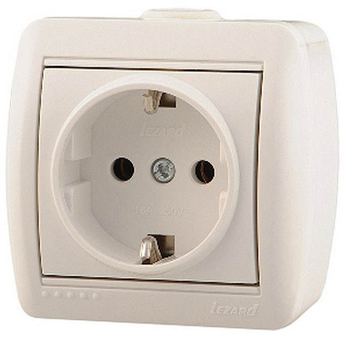 Розетка силовая с заземлением Lezard Nata кремовая с керамической основой, открытая установка. Ток 16А, напряжение 220В. Применяется в деревянных домах, дачах и подсобных помещениях, где требуется поверхностный монтаж.